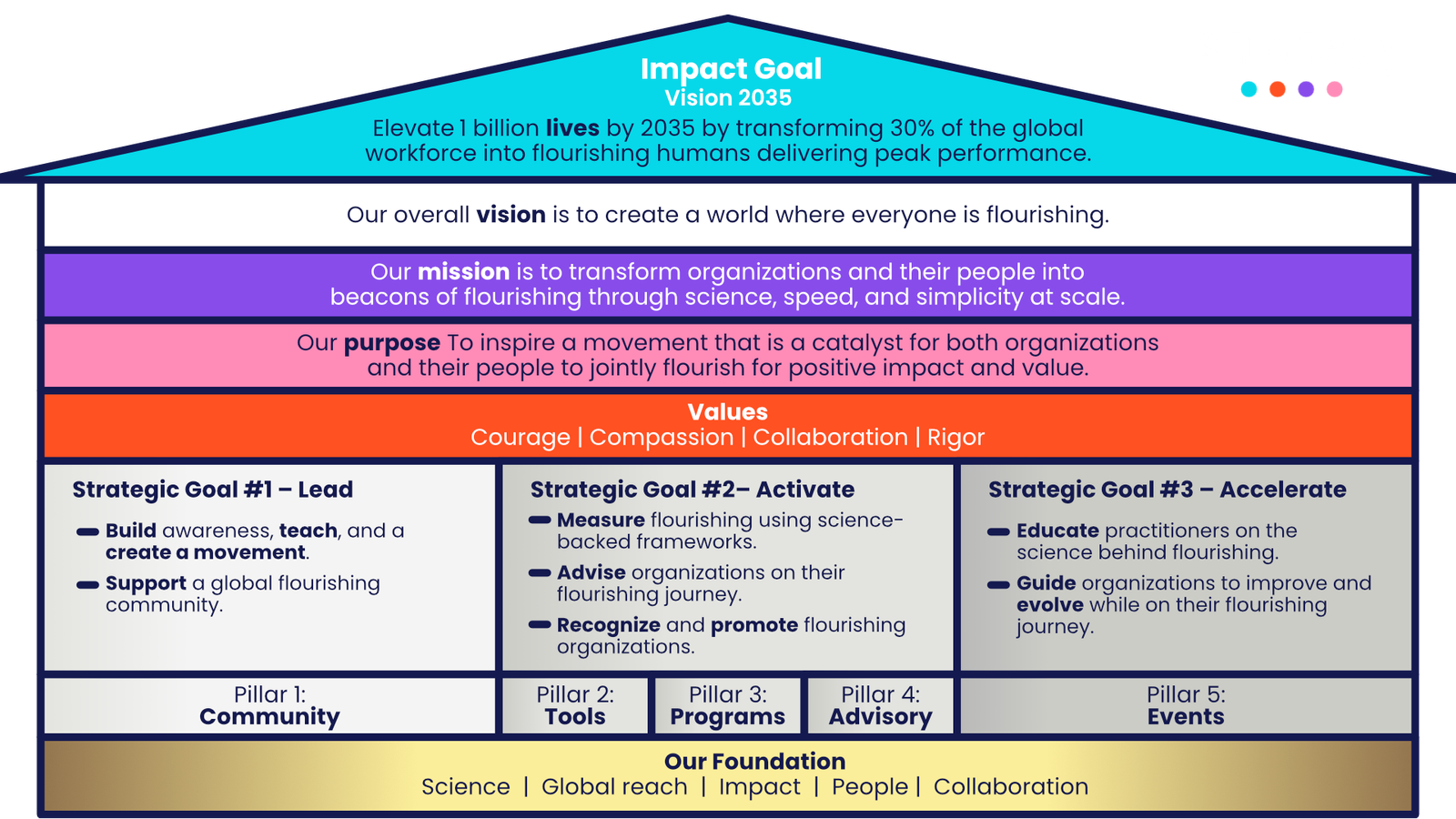 Our Big Hairy Audacious Goal (BHAG) is called Vision 2035: to elevate 1 billion lives by 2035 by transforming 30% of the global workforce into flourishing humans delivering peak performance. Our roadmap identifies key milestones. These include building a global flourishing community, curating science-backed measurement tools, and providing advisory and educational programs that collectively move organizations and individuals toward greater well-being and performance.